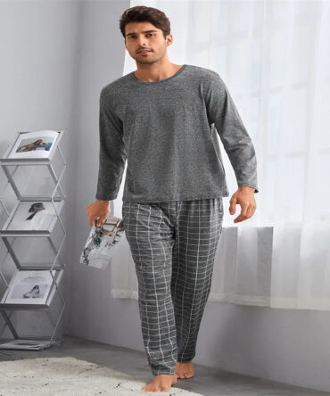 Men Casual Round Neck Long Sleeve Pajamas Plaid Trousers Suit