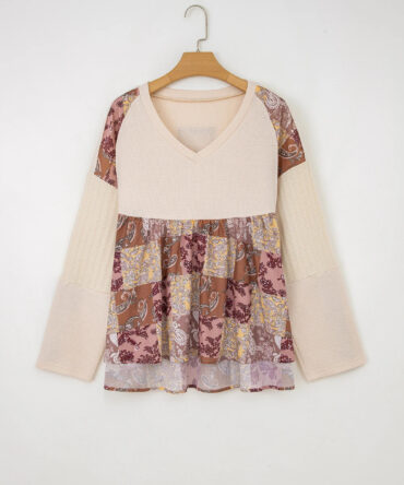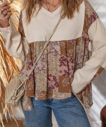 Beige Paisley Ethnic Print Contrast Patchwork Long Sleeve Loose Top