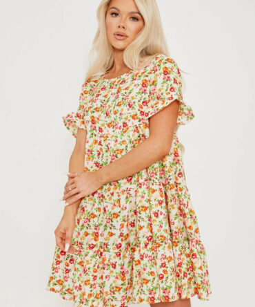 Multi Ditsy Floral Print Frill Tiered Smock Dress