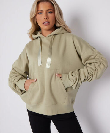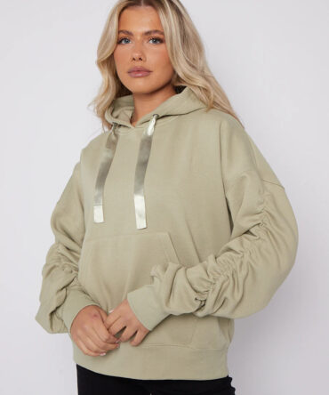 Ribbon Drawstring Ruched Sleeves Fleeced Hoodie