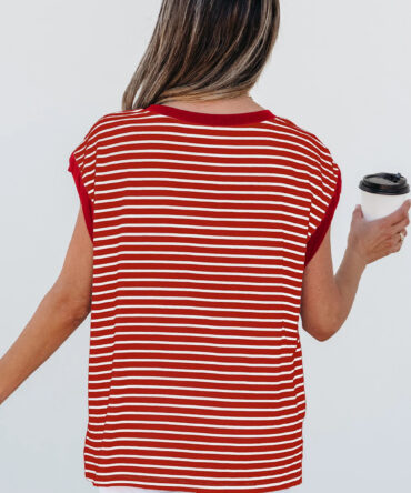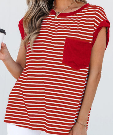 Red Stripe Chest Pocket Patch Round Neck Tank Top
