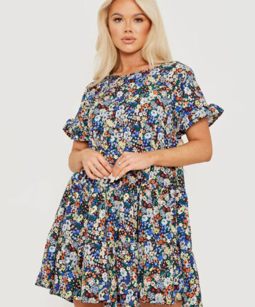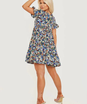 Multi Ditsy Floral Print Frill Tiered Smock Dress
